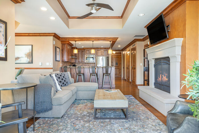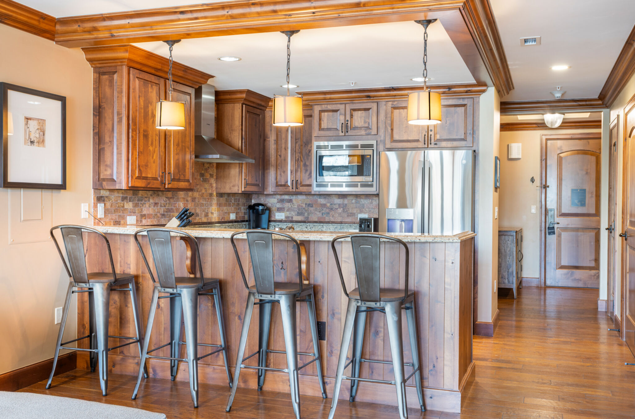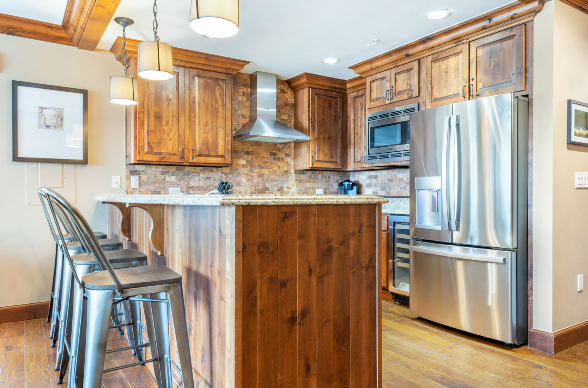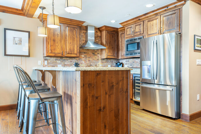 The gourmet kitchen is designed for both everyday living and effortless entertaining, featuring premium appliances, rich custom cabinetry, and generous counter space. Flowing seamlessly into the living and private dining areas, it is perfectly suited for après-ski gatherings or intimate dinners at home.