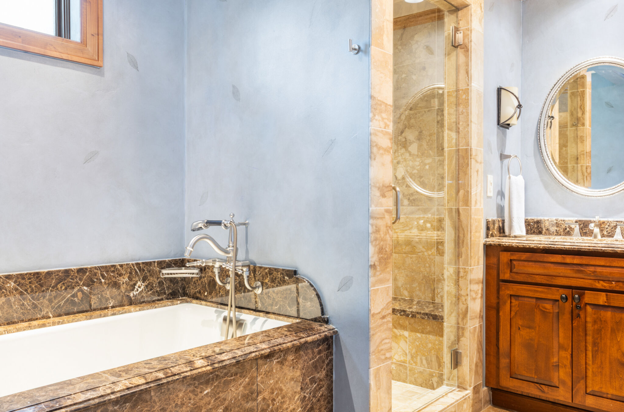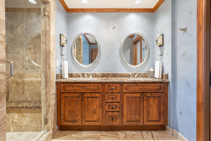 The thoughtfully designed living area is centered around a gas fireplace with a stone surround, providing a warm and inviting space to relax after a day enjoying all that the Vail lifestyle has to offer. Abundant oversized windows flood the residence with natural light while beautifully framing the mountain views, enhancing its open, airy ambiance and refined mountain aesthetic.