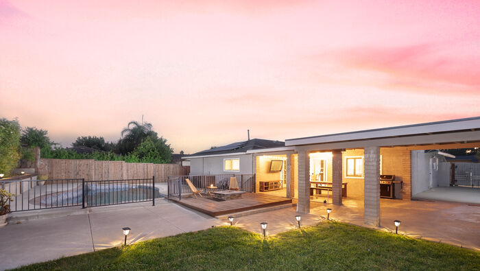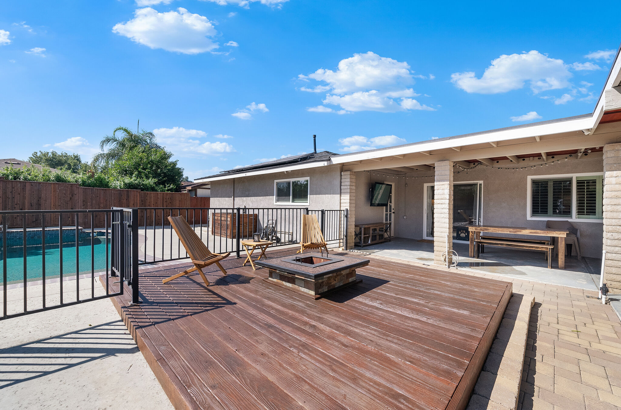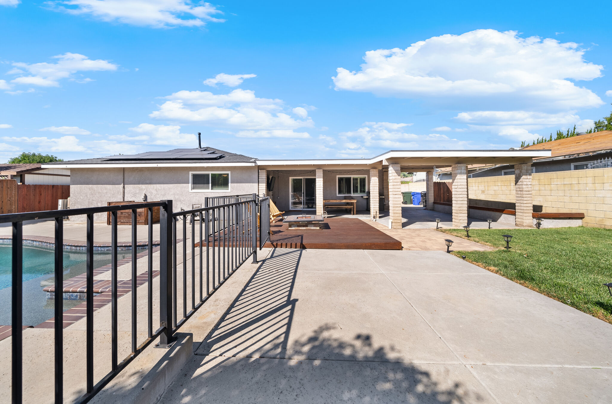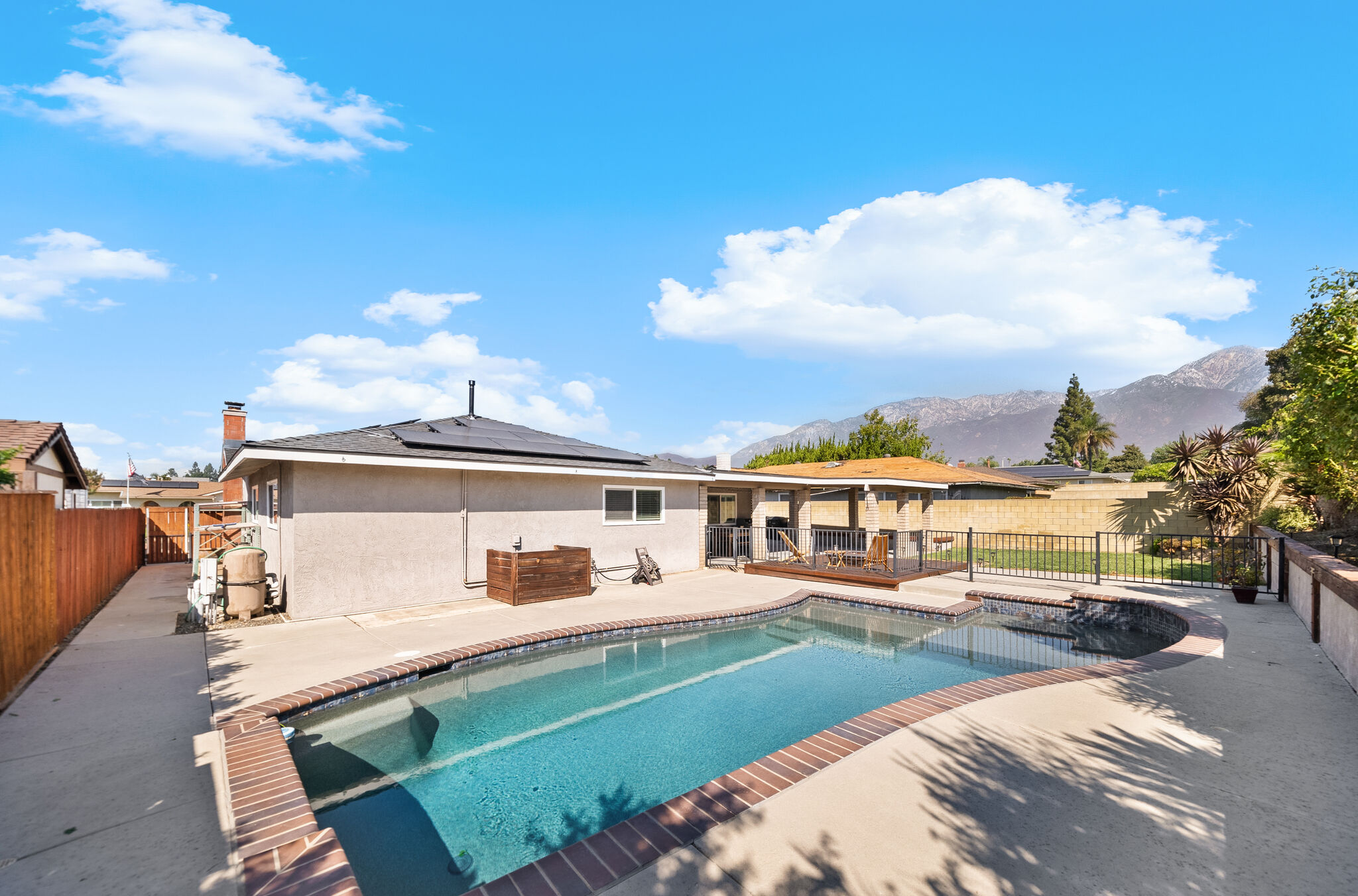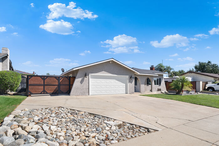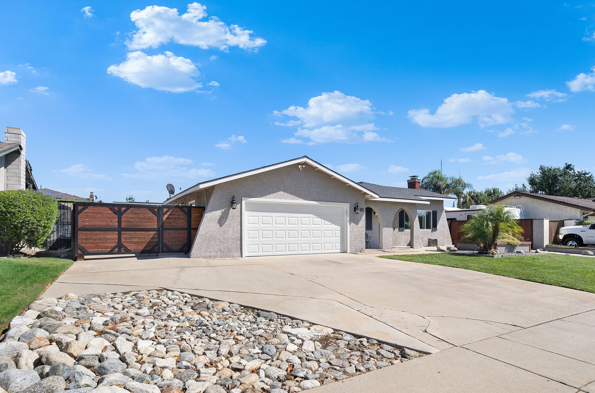 This beautifully updated single-story home offers comfort, style, and functionality, all in one!! Featuring RV parking, a freshly painted exterior, and a 2-car garage, this home is ready to welcome its new owners. The large family room boasts a vaulted ceiling, cozy fireplace, built-in bookshelves, and a mantle with custom lighting. Perfect for relaxing or entertaining. The kitchen is equipped with ample cabinet space, granite countertops, recessed lighting, and a walk-in pantry for all your storage needs. A generous family room includes a built-in media niche with extra shelving, ideal for storage or display. There’s also a custom-made desk area, perfect for studying or working from home. The primary bedroom features crown molding, a ceiling fan, and convenient access to the backyard. The updated primary bathroom boasts an oversized walk-in shower for a luxurious touch. Enjoy engineered wood flooring throughout most of the home, crown molding, and new dual pane windows for energy efficiency. The home also is equipped with a Tesla charger, an ADT security system, a newly installed furnace with an air conditioner evaporator, and a whole-house fan. Step into the backyard, where you will find a covered patio, a wood deck with a firepit and seating area, and a stunning swimming pool with a pebble-tech bottom. Solar panels add energy savings. With modern updates, a versatile layout, and outdoor features perfect for entertaining. This home is ideal for any family. Don’t miss your chance to make it your own!