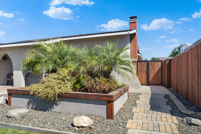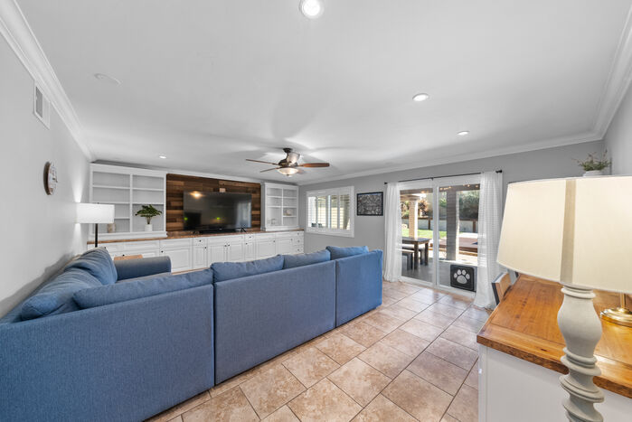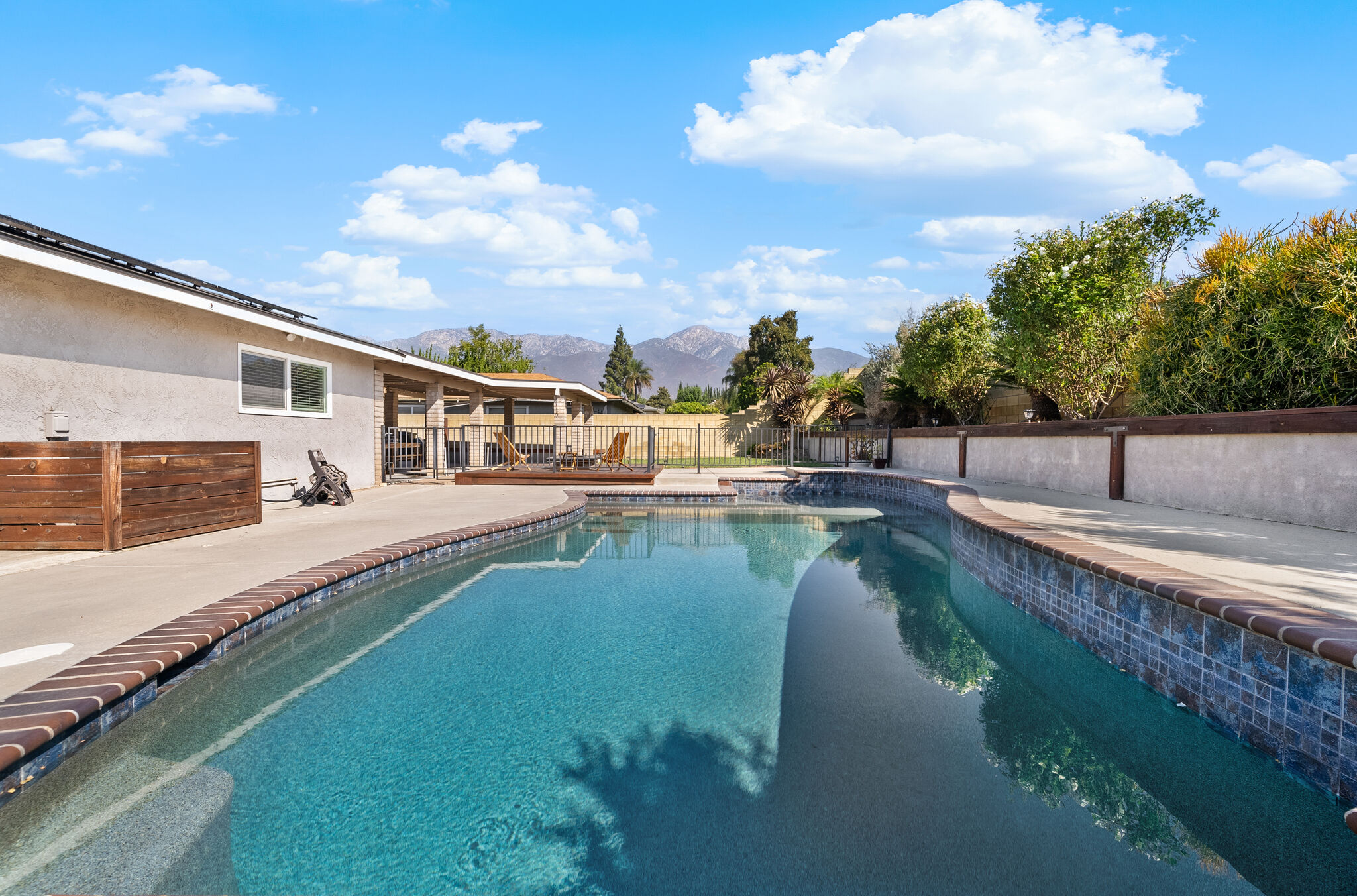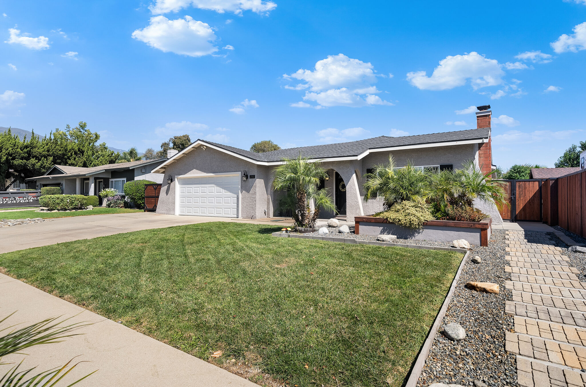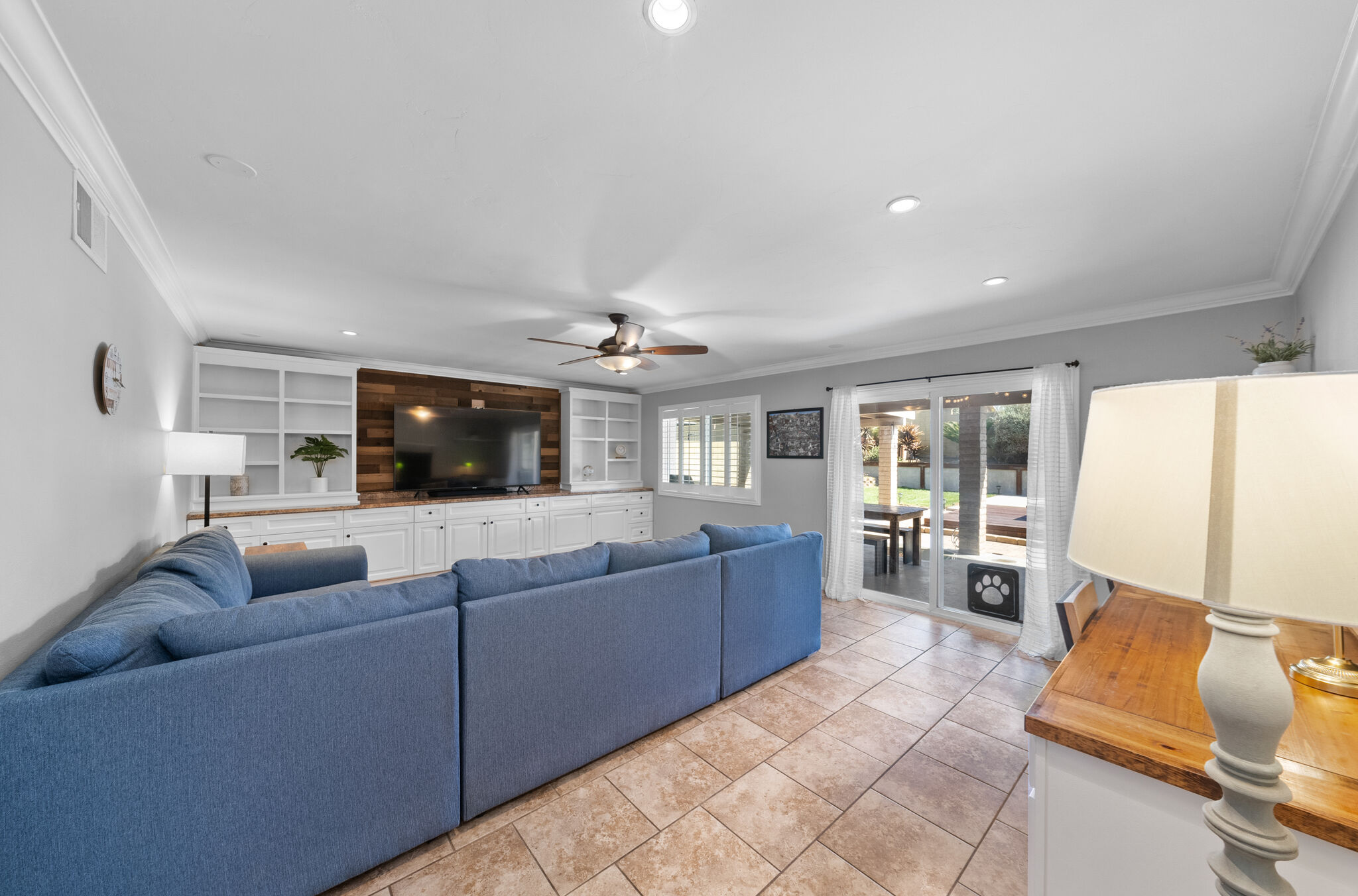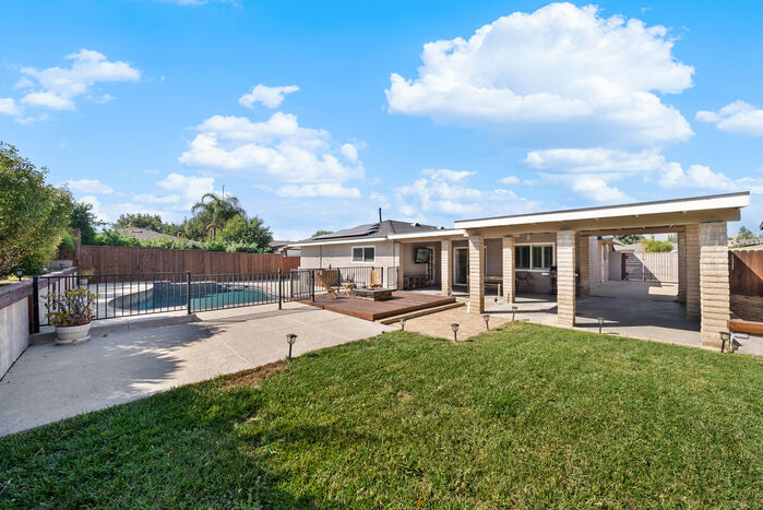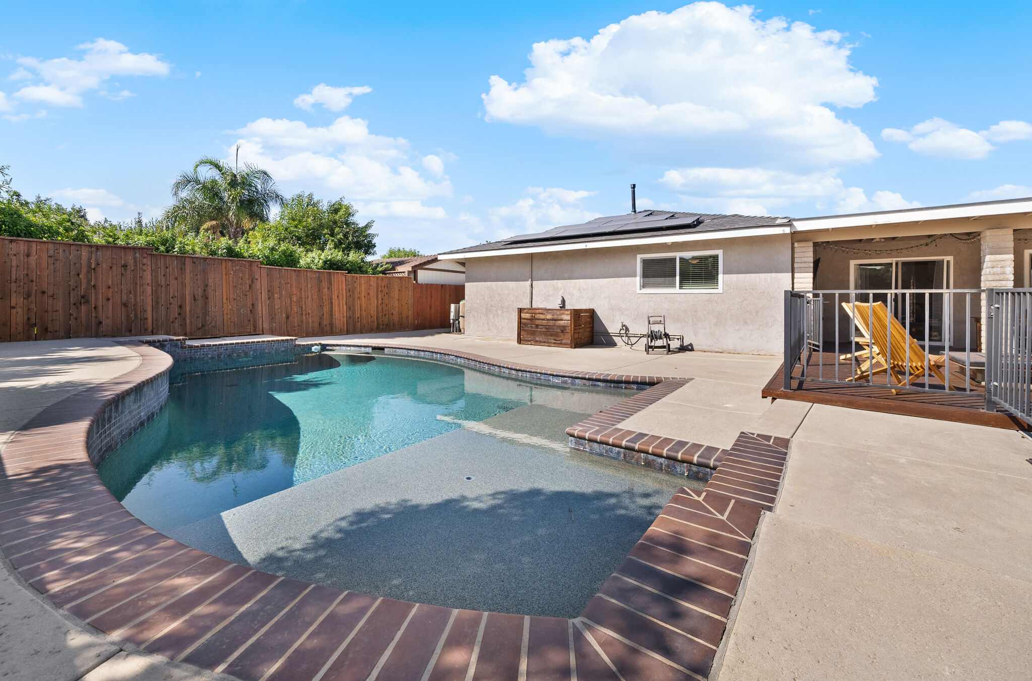 This beautifully updated single-story home offers comfort, style, and functionality, all in one!! Featuring RV parking, a freshly painted exterior, and a 2-car garage, this home is ready to welcome its new owners. The large family room boasts a vaulted ceiling, cozy fireplace, built-in bookshelves, and a mantle with custom lighting. Perfect for relaxing or entertaining. The kitchen is equipped with ample cabinet space, granite countertops, recessed lighting, and a walk-in pantry for all your storage needs. A generous family room includes a built-in media niche with extra shelving, ideal for storage or display. There’s also a custom-made desk area, perfect for studying or working from home. The primary bedroom features crown molding, a ceiling fan, and convenient access to the backyard. The updated primary bathroom boasts an oversized walk-in shower for a luxurious touch. Enjoy engineered wood flooring throughout most of the home, crown molding, and new dual pane windows for energy efficiency. The home also is equipped with a Tesla charger, an ADT security system, a newly installed furnace with an air conditioner evaporator, and a whole-house fan. Step into the backyard, where you will find a covered patio, a wood deck with a firepit and seating area, and a stunning swimming pool with a pebble-tech bottom. Solar panels add energy savings. With modern updates, a versatile layout, and outdoor features perfect for entertaining. This home is ideal for any family. Don’t miss your chance to make it your own!