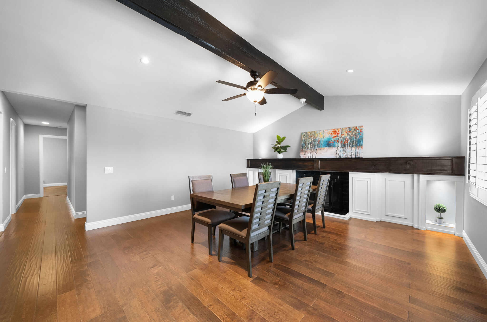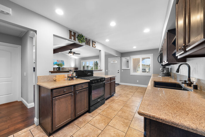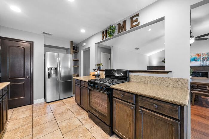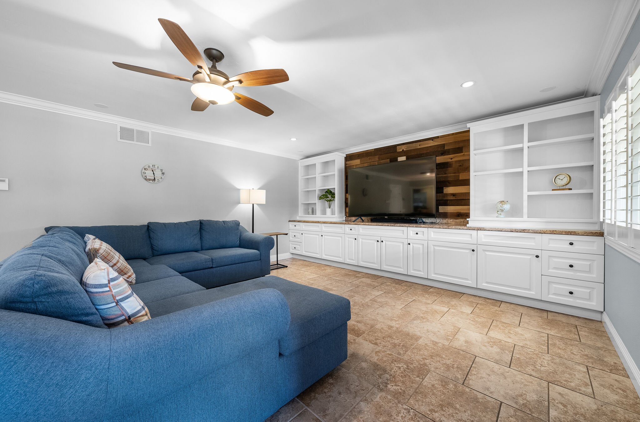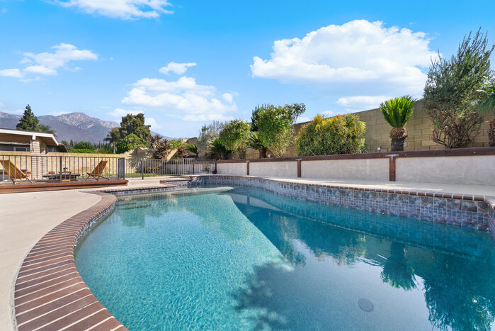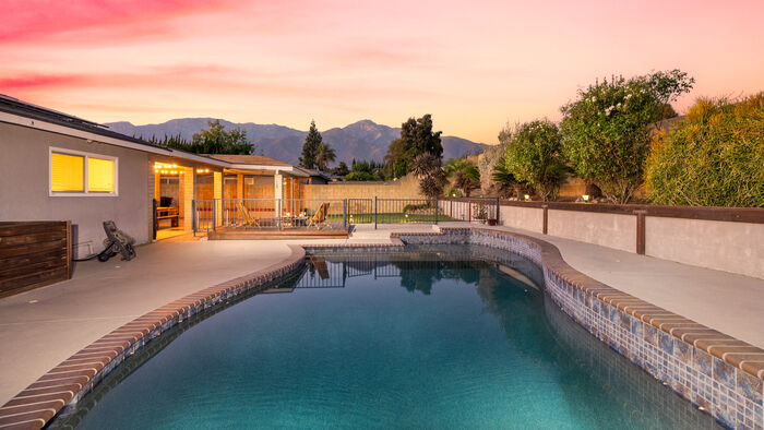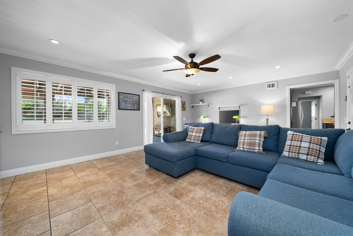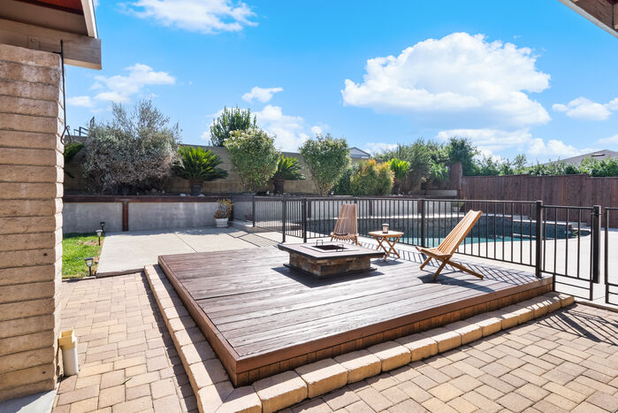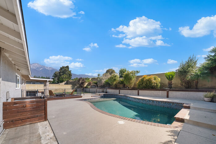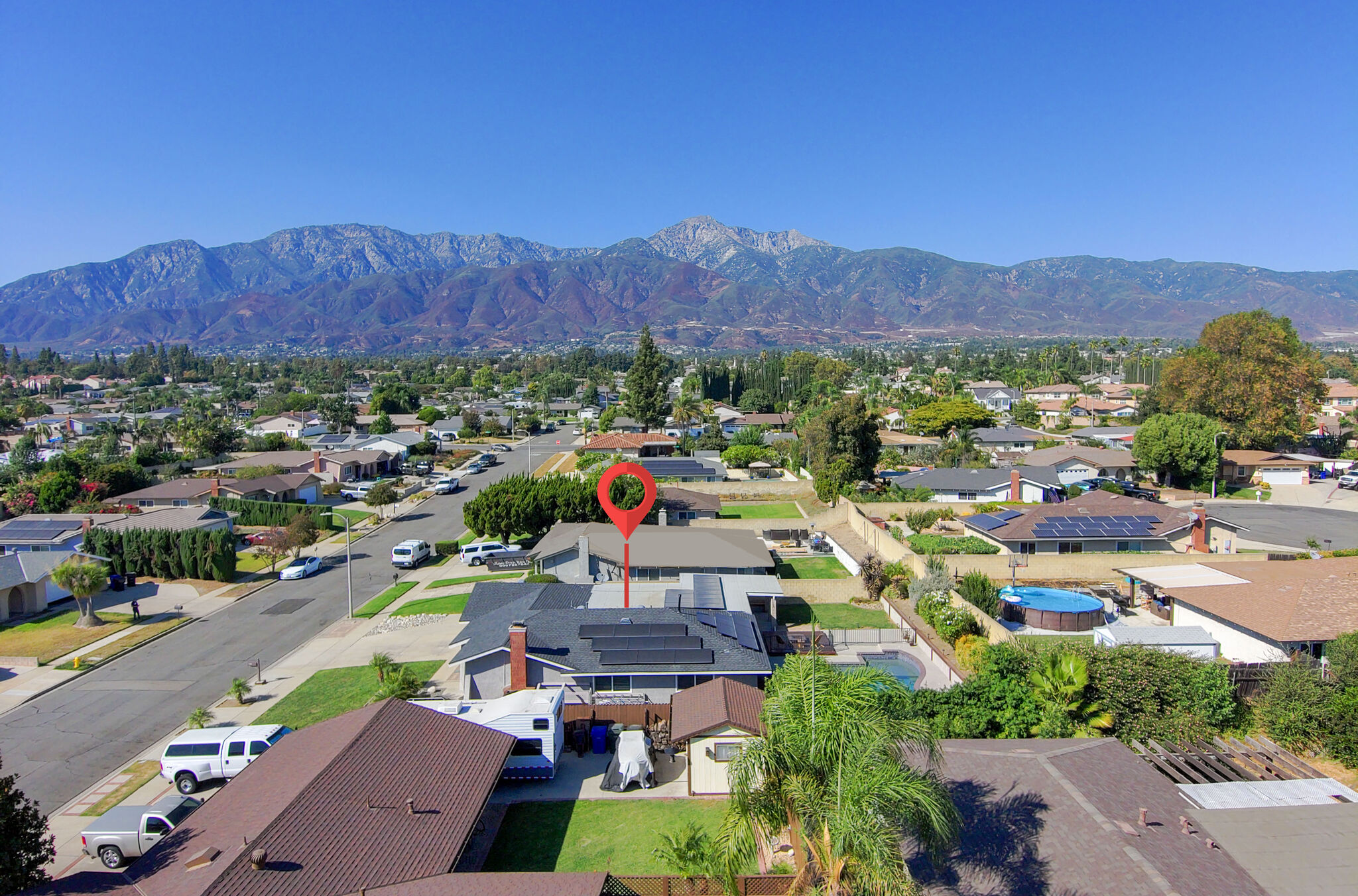 This beautifully updated single-story home offers comfort, style, and functionality, all in one!! Featuring RV parking, a freshly painted exterior, and a 2-car garage, this home is ready to welcome its new owners. The large family room boasts a vaulted ceiling, cozy fireplace, built-in bookshelves, and a mantle with custom lighting. Perfect for relaxing or entertaining. The kitchen is equipped with ample cabinet space, granite countertops, recessed lighting, and a walk-in pantry for all your storage needs. A generous family room includes a built-in media niche with extra shelving, ideal for storage or display. There’s also a custom-made desk area, perfect for studying or working from home. The primary bedroom features crown molding, a ceiling fan, and convenient access to the backyard. The updated primary bathroom boasts an oversized walk-in shower for a luxurious touch. Enjoy engineered wood flooring throughout most of the home, crown molding, and new dual pane windows for energy efficiency. The home also is equipped with a Tesla charger, an ADT security system, a newly installed furnace with an air conditioner evaporator, and a whole-house fan. Step into the backyard, where you will find a covered patio, a wood deck with a firepit and seating area, and a stunning swimming pool with a pebble-tech bottom. Solar panels add energy savings. With modern updates, a versatile layout, and outdoor features perfect for entertaining. This home is ideal for any family. Don’t miss your chance to make it your own!
