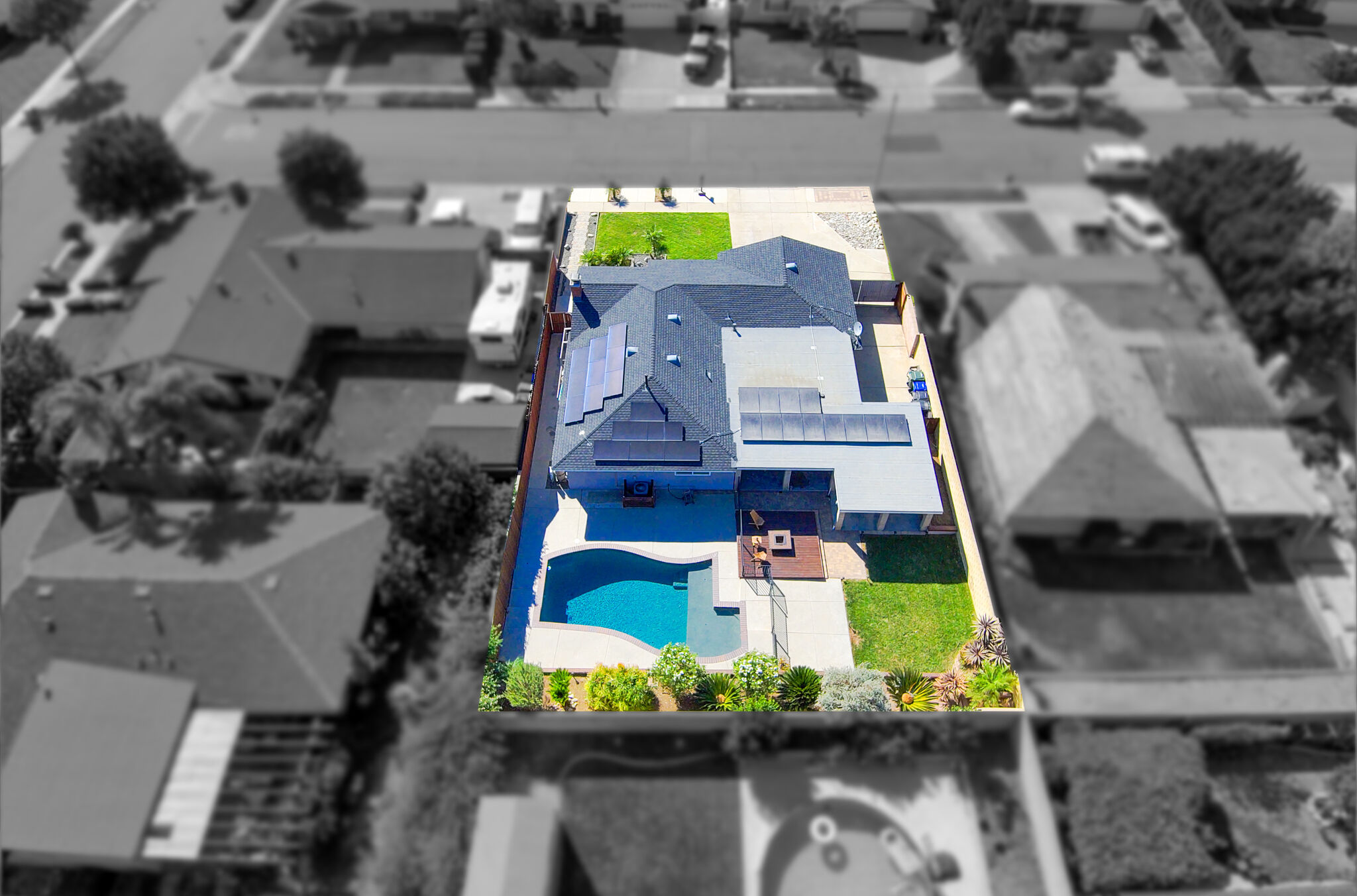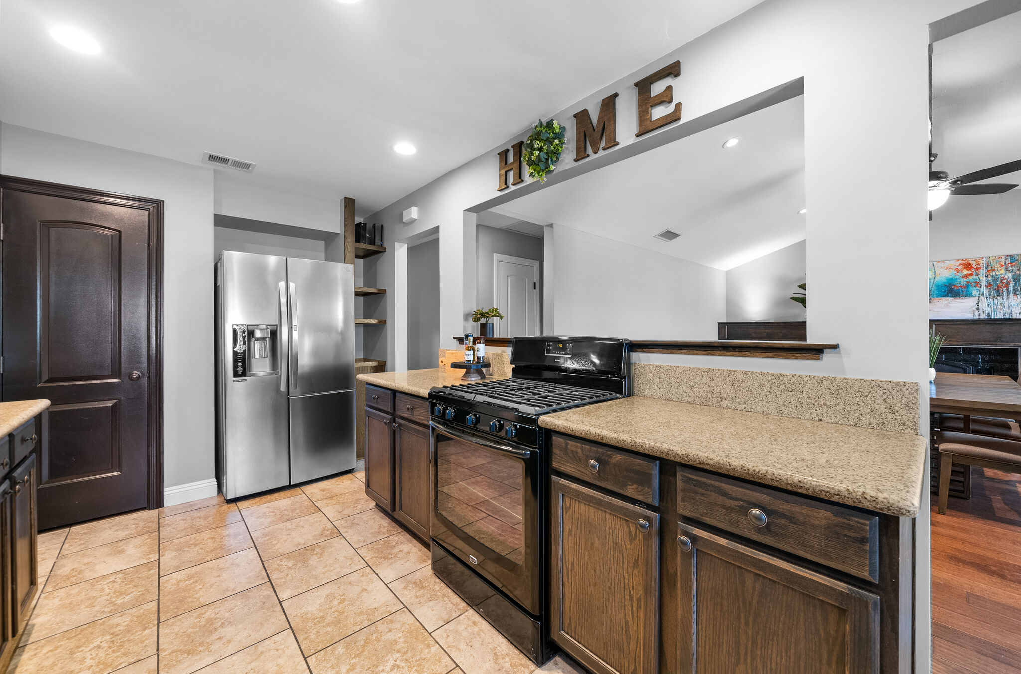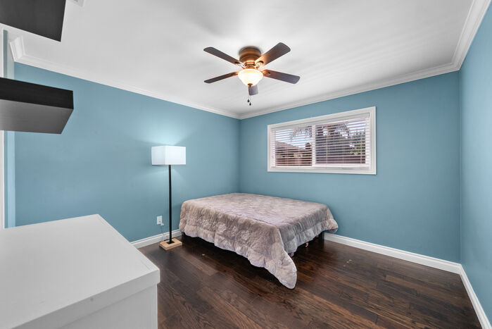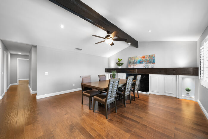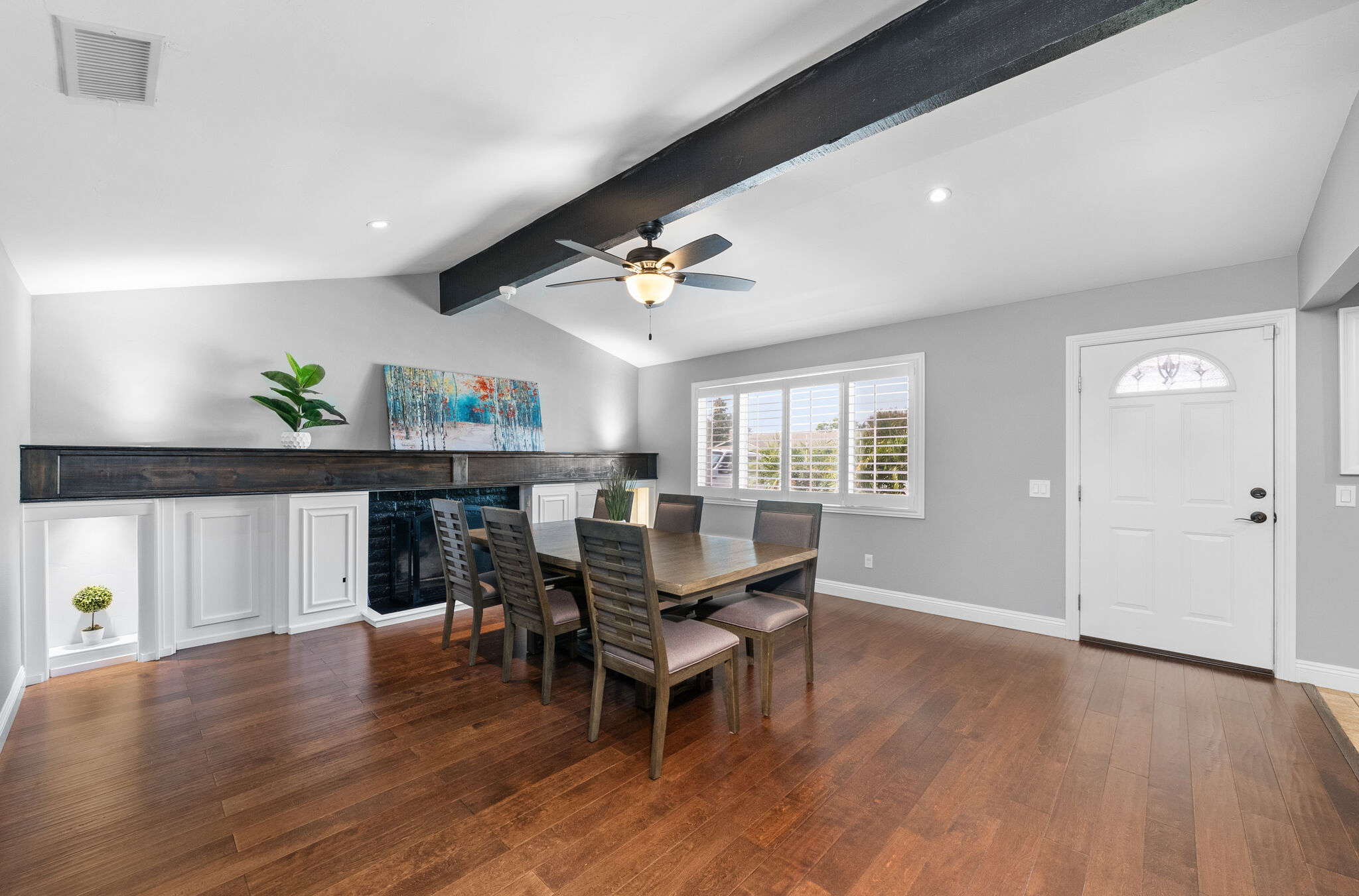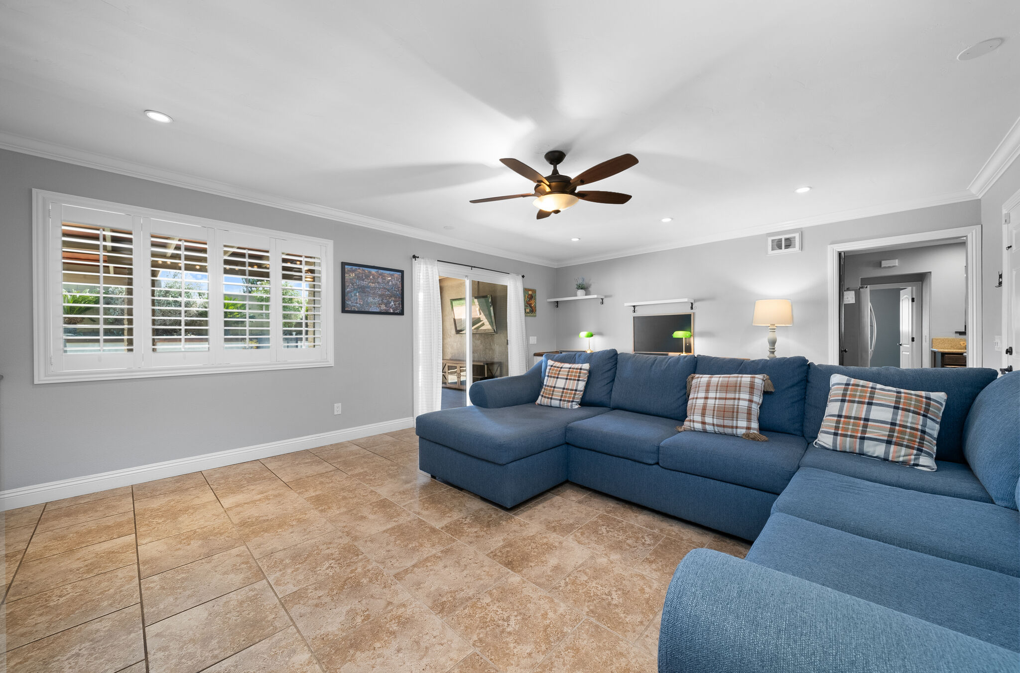 This beautifully updated single-story home offers comfort, style, and functionality, all in one!! Featuring RV parking, a freshly painted exterior, and a 2-car garage, this home is ready to welcome its new owners. The large family room boasts a vaulted ceiling, cozy fireplace, built-in bookshelves, and a mantle with custom lighting. Perfect for relaxing or entertaining. The kitchen is equipped with ample cabinet space, granite countertops, recessed lighting, and a walk-in pantry for all your storage needs. A generous family room includes a built-in media niche with extra shelving, ideal for storage or display. There’s also a custom-made desk area, perfect for studying or working from home. The primary bedroom features crown molding, a ceiling fan, and convenient access to the backyard. The updated primary bathroom boasts an oversized walk-in shower for a luxurious touch. Enjoy engineered wood flooring throughout most of the home, crown molding, and new dual pane windows for energy efficiency. The home also is equipped with a Tesla charger, an ADT security system, a newly installed furnace with an air conditioner evaporator, and a whole-house fan. Step into the backyard, where you will find a covered patio, a wood deck with a firepit and seating area, and a stunning swimming pool with a pebble-tech bottom. Solar panels add energy savings. With modern updates, a versatile layout, and outdoor features perfect for entertaining. This home is ideal for any family. Don’t miss your chance to make it your own!
