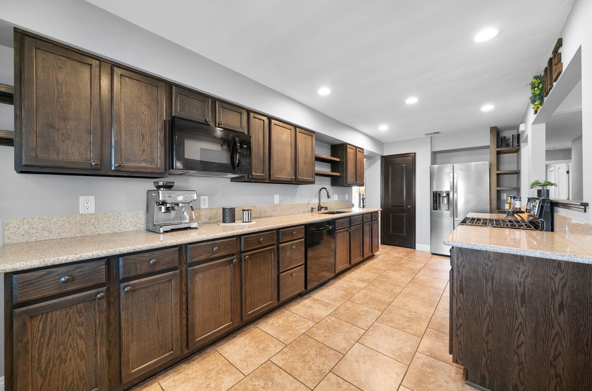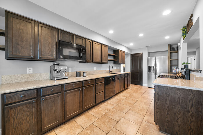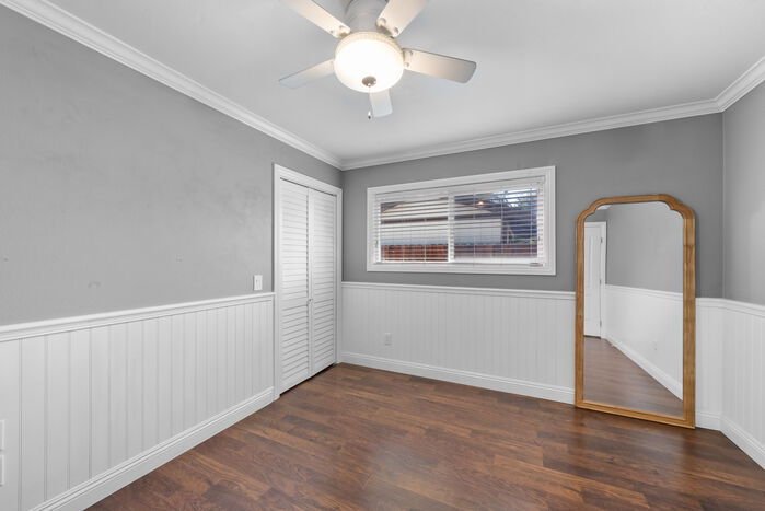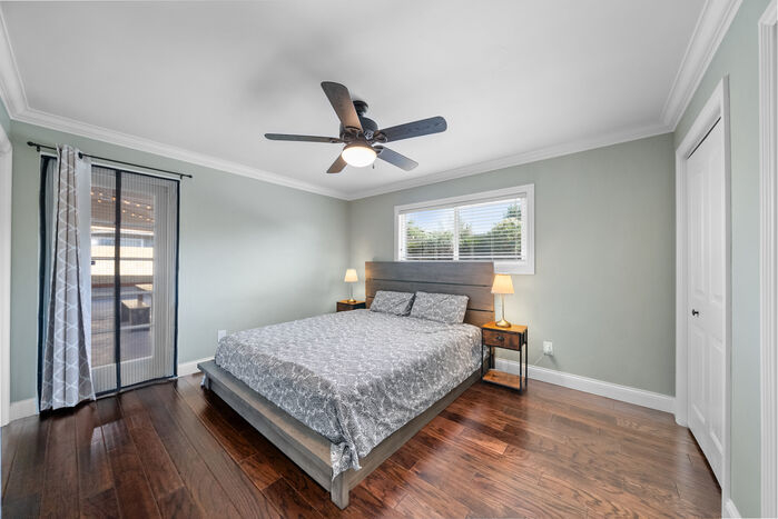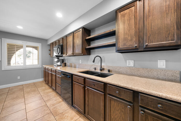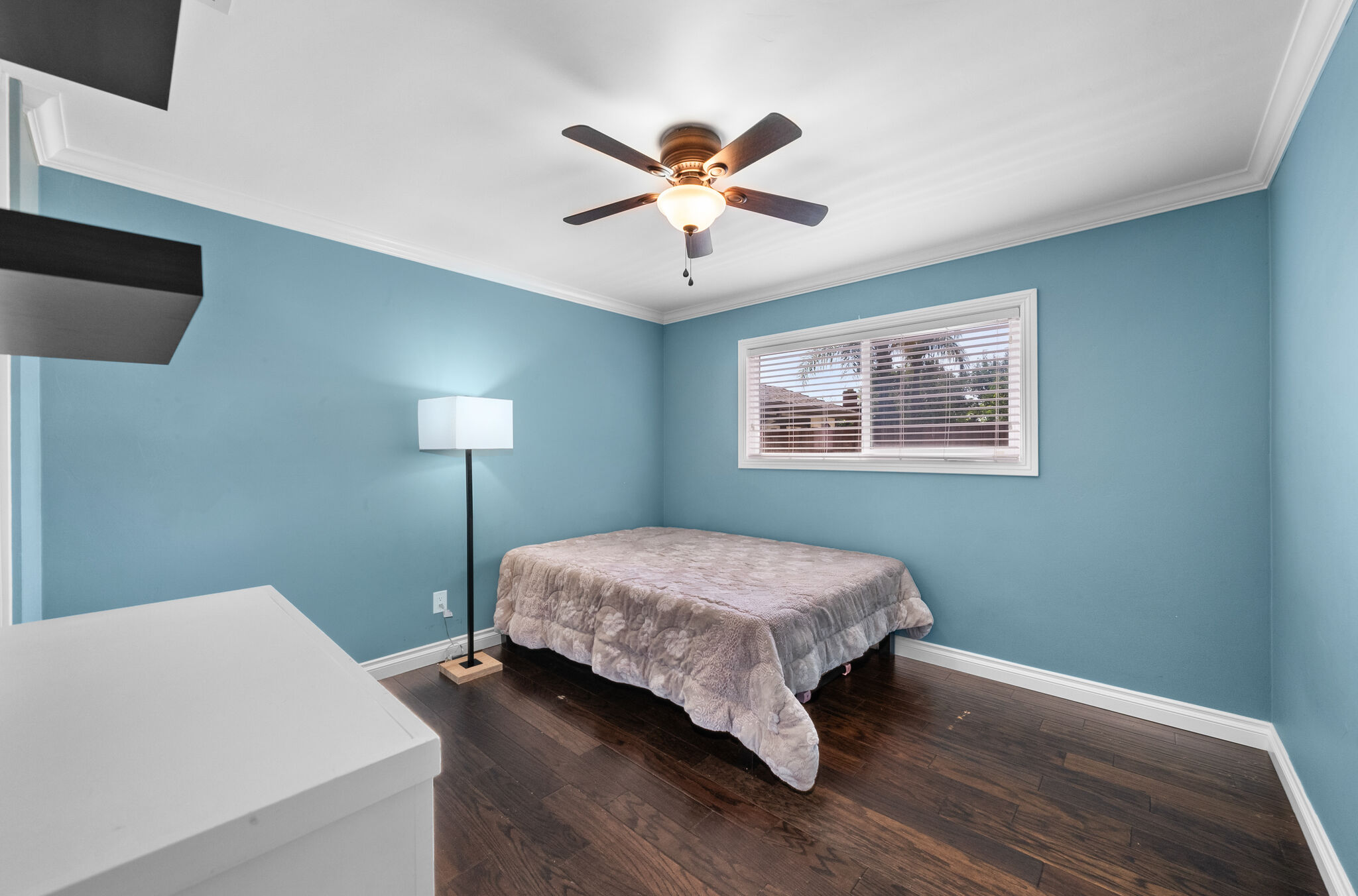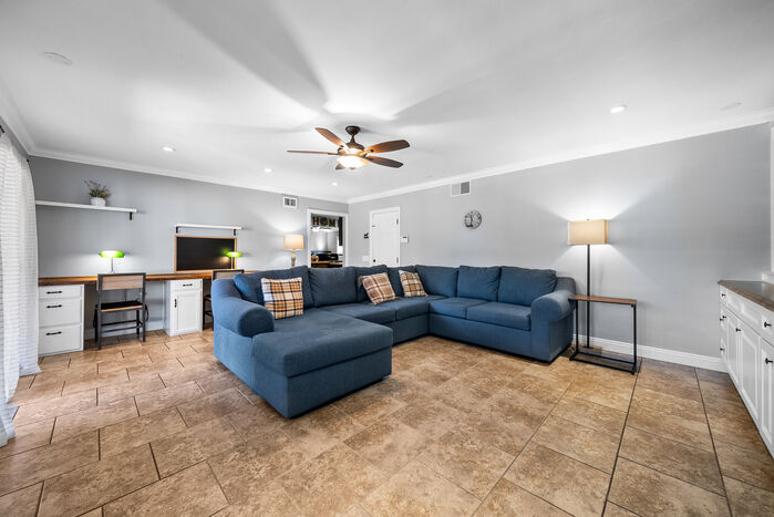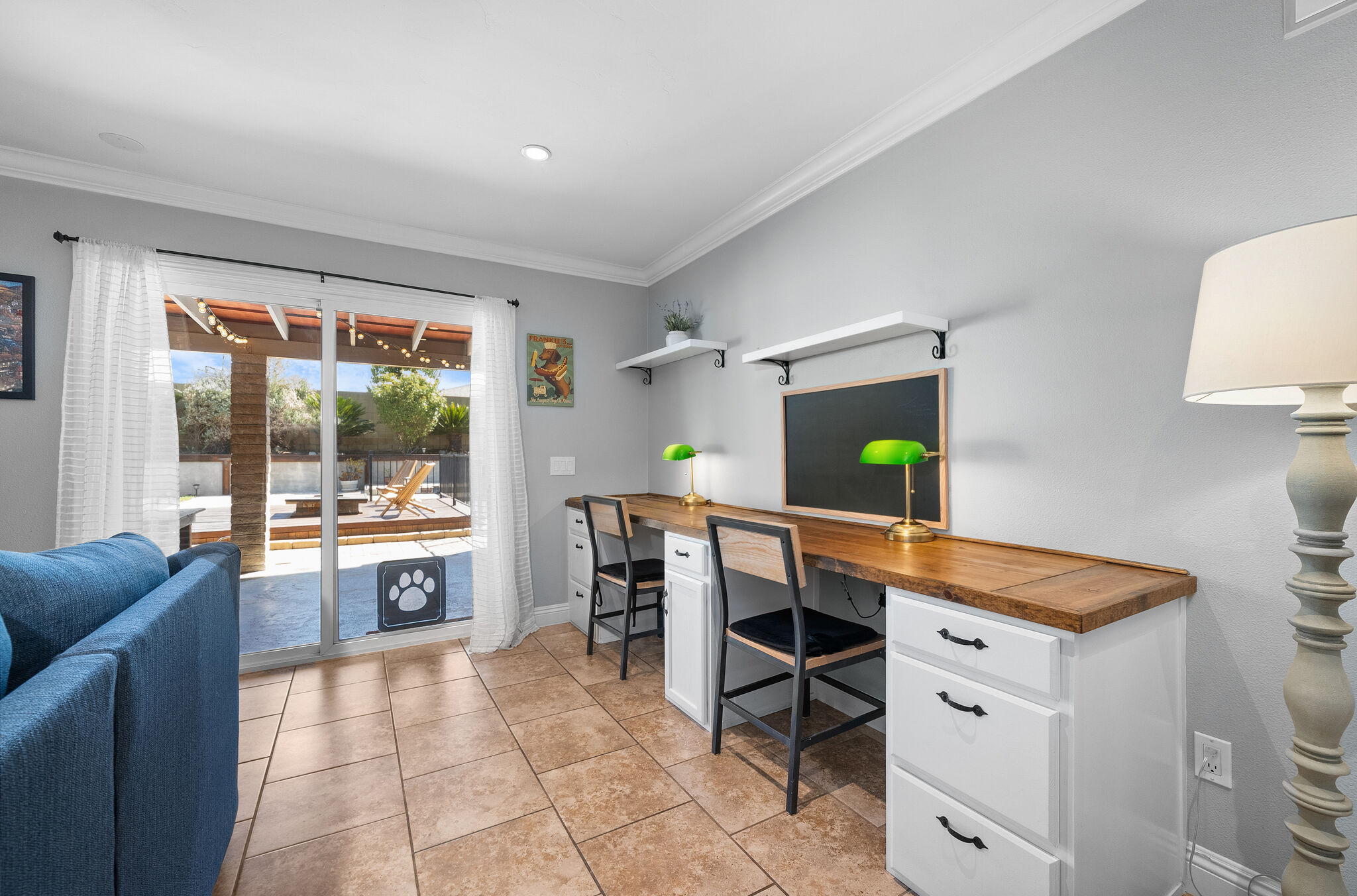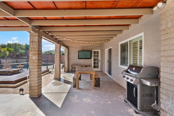 This beautifully updated single-story home offers comfort, style, and functionality, all in one!! Featuring RV parking, a freshly painted exterior, and a 2-car garage, this home is ready to welcome its new owners. The large family room boasts a vaulted ceiling, cozy fireplace, built-in bookshelves, and a mantle with custom lighting. Perfect for relaxing or entertaining. The kitchen is equipped with ample cabinet space, granite countertops, recessed lighting, and a walk-in pantry for all your storage needs. A generous family room includes a built-in media niche with extra shelving, ideal for storage or display. There’s also a custom-made desk area, perfect for studying or working from home. The primary bedroom features crown molding, a ceiling fan, and convenient access to the backyard. The updated primary bathroom boasts an oversized walk-in shower for a luxurious touch. Enjoy engineered wood flooring throughout most of the home, crown molding, and new dual pane windows for energy efficiency. The home also is equipped with a Tesla charger, an ADT security system, a newly installed furnace with an air conditioner evaporator, and a whole-house fan. Step into the backyard, where you will find a covered patio, a wood deck with a firepit and seating area, and a stunning swimming pool with a pebble-tech bottom. Solar panels add energy savings. With modern updates, a versatile layout, and outdoor features perfect for entertaining. This home is ideal for any family. Don’t miss your chance to make it your own!